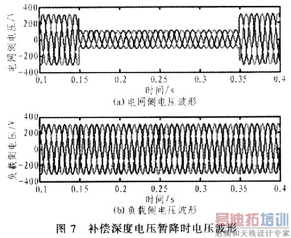 在浅度电压暂降补偿状态时,能量由变换器A提供。图6给出了电压暂降时的动态补偿波形,由图6可以看出系统补偿动态响应速度快,同时具有良好的稳定性和跟踪性能。