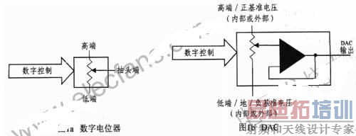 利用数字输入控制微调模拟输出有两种选择:电位器">数字电位器和数/模转换器(DAC),两者均采用数字输入控制模拟输出。通过数字电位器可以调整模拟电压;通过DAC既可以调整电流,也可以调整电压。电位器有三个模拟连接端:高端、抽头端(或模拟输出)和低端(见图1a)。DAC具有队应的三个端点:高端对应于正基准电压,抽头端对应于DAC输出,低端则可能对应于接地端或负基准电压端(见图1b)。