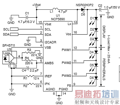 图4:采用NCP5890的多个白光LED应用电路图NCP5890是一款独特的照明管理器,在极小封装中集成了LCD背光、装饰光控制和环境光感测功能。该器件输出电压为30 V,可管理多达8个串联LED,实现LCD屏幕的均衡背光。该器件还可控制三组白光LED或RGB LED,在键盘或底盘上营造出装饰光图案。NCP5890是紧凑型智能手机和便携式媒体播放器专用解决方案。此外,NCP5890还内置了渐进调光功能来营造淡入淡出效果。环境光感测和渐进调光都是内置的自动化功能,可以简单IC指令激活。该器件支持IC协议,有两种不同的地址选项,还具有真关断(true cut-off)功能,限制关闭模式下的泄漏输出,以延长电池使用时间。 总结 安森美半导体身为用于绿色电子产品的首要高性能、高能效硅方案供应商,运用其在低压和高压技术、电源管理方面的专长,针对背光应用提供了多样化解决方案。除了本文着重介绍的一些典型应用,安森美半导体还有各种为不同应用优化的LED驱动器,以及创新的GreenPoint®工具,帮助设计人员实现交互式网上设计及验证,加速固态照明方案的设计。