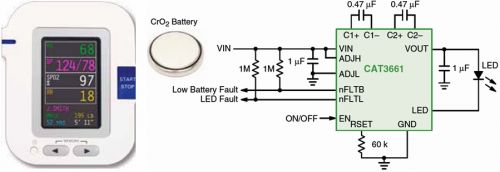 图1:大屏幕LED背光液晶电视侧光式方案(黄色背景部分) (2)直下式方案:除了侧光式方案,安森美半导体还提供基于NCP1397、NDF05N50和NCP1034的直下式降压驱动方案。NCP1034采用高达500 kHz的可编程开关频率驱动一对外部N沟道MOSFET,能够灵活调节集成电路的工作,以符合系统级要求。另外,内部1.25 V参考电压可以对输出电压精密稳压,用于低压应用。该器件具有预防电气故障的保护特性,如欠压锁定和断续(hiccup)电流限制,在发生故障时可提供系统级安全性。其优势包括驱动高能效场效应管(FET)及为1颗或多颗器件提供固定频率。 安森美半导体还为LED背光液晶电视提供了更多一站式方案,包括功率因数校正(PFC)、待机开关电源,以及相关的整流器、运算放大器、MOSFET及分立器件等。 2. 便携式设备LED背光方案对便携式电子设备设计人员来说,高效能和小尺寸通常是最优先考虑的因素。安森美半导体推出了各种为便携式设备优化的LED背光方案,如用于扣式电池供电设备的低功率LED背光驱动器,以及用于手机和数码相机等的LED背光驱动器,以配合客户在获得小尺寸设计的同时延长电池使用时间,推出符合用户需求的创新产品。 (1)钮扣式电池供电设备LED背光驱动器:越来越多的创新型便携设备采用了钮扣式电池,如血糖仪、数字体温计、血氧计、呼吸分析仪和生理监测仪等。由于这种电池的独特特性以及需要长工作寿命,这些紧凑型应用需要定制的LED驱动器,不仅要管理背光,还要监测电池电量。 这类应用可采用安森美半导体新的CAT3661单LED驱动器,图3是其应用电路图。该器件采用安森美半导体专利的四模(Quad Mode)电荷泵架构,能效高达92%,静态电流低至150 μA,提供可调节的低电池电量检测、强固的LED故障监测、软启动和短路限制等功能,采用低高度3 x 3 mm TQFN-16封装,非常适合这类应用。