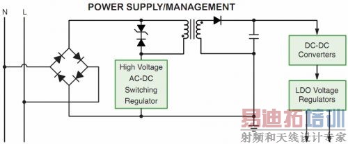 图3:PLC智能电表电源/电源管理模块示意图。 在AC-DC部分,可以采用安森美半导体的一系列单片高压开关稳压器,如NCP1014、NCP1027、NCP1051等。以NCP1014为例,这是一款低功率离线电源用自供电高压单片开关稳压器,集成了1个固定频率电流模式控制器和1个700 V MOSFET,主要功能特性包括软启动、频率抖动、短路保护、跳周期和最大峰值电流设定点等。