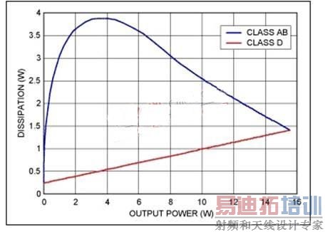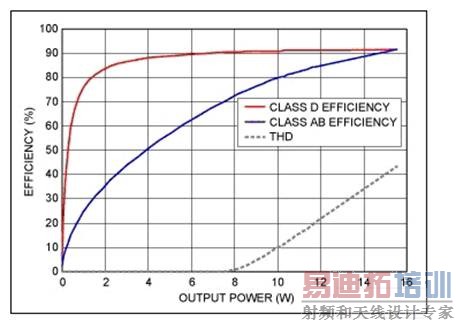 从图3可以看出,D类放大器比AB类放大器具有更高的效率,图中仅在两个工作点处D类放大器的效率没有超出AB类放大器: