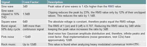 当正弦波建立稳定的读数后,它们并不是模拟音乐或语音信号源,因为这些信号的幅度是随时间变化的,信号幅度范围从静音到过驱动(箝位)。幅度分布由振幅因数描述,它是(音乐或语音信号源)峰值功率与平均功率的比值,用dB表示,以下统称为峰均比。