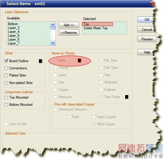 就是说阻焊要比pad大多少,图上是10Mil。不过,有的时候想精确的控制soldermask大小,比如说在一些BGA封装上,就要自己定义soldermask层了,这时候出soldermask gerber的时候就不需要把top层选上了,而是要把soldermask层的pad选上了,但是这个时候你所有的零件都应该要有soldermask层,不然gerber就会出问题。当然,从标准的角度上说,一个焊盘是要定义solder mask层才可以出这一层的gerber的,但是PADS帮我们简化了这一步骤,使得用户可以不用定义这一层。