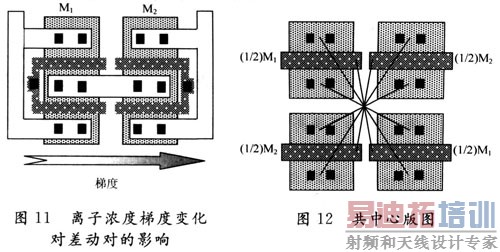 对于大的晶体管,对称性就变得更困难了。例如,在图11所示的差分对中,为使输人失调电压较小,这两个晶体管的宽度都比较大,但沿x轴方向的梯度会引起明显的失配。为了减小失配,可以采用"共中心"的布局方法。这样沿x轴和y轴方向的一阶梯度效应就会互相抵消。如图12所示,这种布局把M1和M2都分成两个宽度为原来50%的晶体管,沿对角放置且并联连接。然而,在版图上布线很困难,经常会导致如图13所示的系统不对称,或者线对地电容及线间电容的不同而引起整体不对称。对于规模大一点的电路,如运放,则引走线可能过于复杂而无法实现。