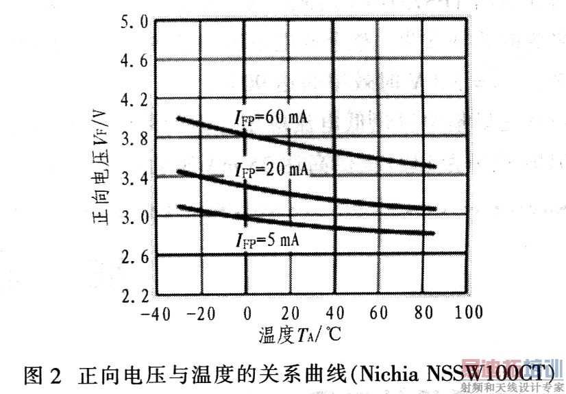 WLED与其他标准p—n结二极管类似,只有对其施加足够的正向电压时才能导通。当外加电压超过阈值时,正向电流随WLED正向电压的增加而增加。图1给出2种WLED的典型I—V曲线。