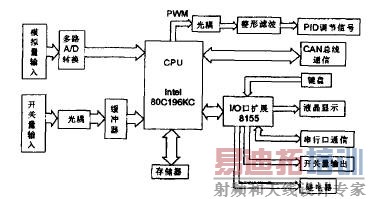 图1:集散控制系统结构框图 系统中的每个节点都以INTEL80C196KC单片机为核心,配以PH IL IPS半导体公司的SJA1000独立CAN控制器和PCA82C250CAN收发器构成。PC机和CAN控制器之间采用双口RAMIDT7132作为双向数据传送通道。现场智能电压电流监控显示报警节点单元另采用北京青云创新科技发展有限公司的液晶显示模块LCM320240ZK和简易键盘,用于显示各智能检测节点单元发送来的现场数据和向各智能检测节点单元发送简短的PID调节等控制命令。智能电压、温度检测节点单元则配以相应的电压、电流、温度传感器及相应的处理电路,以完成电压、电流及温度信号的采集工作。 图1中的各个智能电压、温度检测节点单元分别安装固定于各单体蓄电池旁,具有相同的硬件结构。其主要功能是采集各单体蓄电池的充放电电压,蓄电池在充放电过程中的温升等现场数据,经过滤波和相应变换后通过CAN 总线网络送到上位机和现场监控显示报警节点单元;现场智能电压、电流监控显示报警节点单元负责检测蓄电池组充放电电压、电流,接收各智能检测节点单元发来的经滤波、变换等处理后的现场数据,对主要参数进行显示、存储,完成对蓄电池组充放电电压、电流的数字P ID调节控制,并对各单体蓄电池进行故障诊断、锁定和报警,其数据交换也是通过CAN总线网络送到上位机。CAN总线网络部分主要由CAN总线通信介质和相应的通信软件组成。本系统通信介质采用双绞线,负载连接在CANH和CANL之间,终端匹配阻抗值为信号的特征阻抗值,约为120Ω。 节点单元硬件设计 节点单元工作原理 本系统中存在现场智能电压电流监控显示报警节点单元和智能电压、温度检测节点单元等不同类型的节点,但其核心电路基本类似,只是外围接口电路和传感器等采集电路有所区别。以带有监控显示报警的节点单元为例,其结构框图如图2所示。