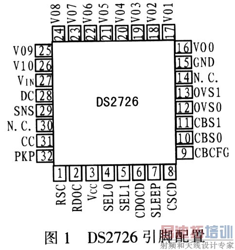 RSC(引脚1):短路门限。该引脚到电池组的正极之间的电阻选择放电方向短路状态下的门限电压;RDOC(引脚2):放电过流电压门限。该引脚与电池组的正极之间所连接的电阻可选择过流状态下在放电方向上的门限电压;Vcc(引脚3):稳压输出。Vcc为内部电路提供电源,并将配置引脚拉高至VIN该引脚应连接1只至少0.1 μF的陶瓷电容旁路至GND;SEL0,SEL1(引脚4、5):电池组所选电池节数。该引脚为三级输入。接地或与Vcc相连分别实现逻辑低或逻辑高,悬空则实现中级门限;CDOCD(引脚6):放电过流延迟时间。该引脚与GND之间所连接的电容用于设置DC FET关断前放电过流状态必须保持的时间;SLEEP(引脚7):睡眠模式选择输入。驱动该引脚为逻辑低强制DS2726进入最低功耗状态。若施加充电电压,DS2726退出睡眠模式。当CBCFG为高电平,该引脚的逻辑高使能电池均衡;CSCD(引脚8):短路电流延迟时间。该引脚与CND之间所连接的电容用于设置DCFET关断前短路电流状态必须保持的时间;CBCFG(引脚9):充电均衡配置输入。当为逻辑低时,若VPKP>VVIN+ VCDET,充电均衡使能;当为逻辑高时,若SLEEP引脚为逻辑高,则充电均衡使能;CBS0,CBS1(引脚10、11):选择电池均衡电压。该引脚输入为三级输入,接地或接VCC分别实现逻辑低或逻辑高,悬空则实现中级门限;OVS0,OVS1(引脚12、13):选择过压门限。该引脚输人为三级输入,接地或接VCC分别实现逻辑低或逻辑高,悬空则实现中级门限。N.C(引脚14、30):悬空,内部无连接;GND(引脚15):接地。接至最低电压电池的负极;V00~V10(引脚16~26):负极电压检测。连接至电池组中的第一节电池的负极;VIN(引脚27):连接至最大电池正极;DC(引脚 28):放电控制输入。CC控制充电FET的栅极,驱动PKP至VOLCC,并导通或关断充电FET;SNS(引脚29):检测输入。连接至充电和放电 FET的漏极。作为基准电压检测短路和放电过流状态;CC(引脚31):充电控制输人。CC控制充电FET的栅极,驱动PKP至VOLCC,并导通或关断充电FET;PKP(引脚32):电池组正极。PKP电压用于检测充电器附件或保护释放状态。