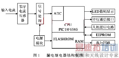 漏电继电器的CPU中采用了PIC18F6585芯片,漏电信号的检测由零序电流互感器来完成,它可将检测到的被保护线路的漏电电流转换成毫伏级的交流电压信号,再通过信号整流、放大和滤波得到一个直流电压,配合相应的控制电路来驱动执行回路,以实现切断保护线路供电电源的控制目的。实现过程是:信号检测→滤波→二级放大→控制电路→驱动执行回路→切断被保护线路电源,其硬件结构框图如图1所示。