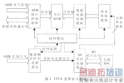 本方案中的数据采集流程如下:系统初始化后,ARM通过控制信号把采样频率、通道选择等参数通知给FPGA,然后FPGA向需要同步采样的通道对应的AD芯片提供统一时钟,使得AD同步地选择相应的通道进行数据的同步采样和转换,其结果由FPGA接收并存储在双口RAM对应的存储空间,然后由ARM从相应的双口RAM空间读取数据进行本地存储或经过网络传输给上位机进行处理。根据以上流程以及FPGA要实现的功能,整个FPGA逻辑设计划分为通道和采样率选择模块、时钟模块、双口RAM模块、AD采样控制模块、串并转换模块、数据存储控制模块、ARM接口控制模块。