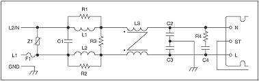 EMI 滤波器经常被设置在一个单独封装内(如图1 的配置)。一般的 EMI 滤波器是穿孔式的,带上共模扼流圈和 Y电容 (线到地),再加两个电感器和 X电容 (线到线)。瞬变保护由 Z1 负责。这结构的输入损耗足以符合级别B 传导排放标准。