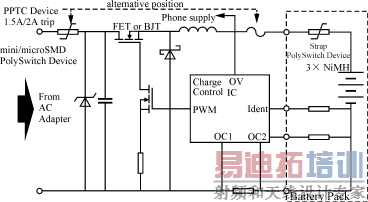 图1是一个典型的电池充电电路。其中,交流电通过AC/DC电源适配器转变为合适电压对电池组进行充电。PPTC元件与过压保护元件协调作用共同完成下列工作: