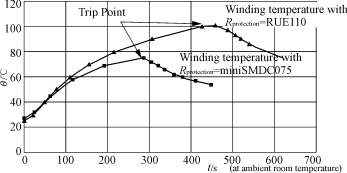 ![]() 图1典型的蓄电池充电电路保护 PPTC元件也可以用于接电池组的装置的端口,以保护由于使用有故障或不匹配的电池组而带来的过电流损害。对各种免提式汽车通话装置或耳机等供电时,电池组输出端保护亦能提供理想的保护功能。 3 AC/DC电源适配器保护 AC/DC电源适配器被广泛地使用于电池充电中,以及为各种消费类电器提供低成本直流电源。使用分离的AC/DC电源适配器,可使终端设备的设计更加简化,并便于通过各类认证标准。 各种电源适配器都有其安全和可靠性要求,包括短路电流限制和变压器线圈过热保护。如果线圈超过了绝缘材料所规定的温度,绝缘层就可能损坏并导致变压器短路,甚至引发火灾。 虽然PPTC元件的过电流保护效果非常显著,但其本身所具有的温度衰减特性却鲜受关注,事实上,这种特征非常适合在过热故障时提供有效保护。 一些变压器线圈通过内置温度保险丝,可以具有过热保护功能。但由于温度保险丝为一次性元件,不适用于防止瞬间故障,如输出端短路或输入电压波动的故障情况。而CPTC(陶瓷PTC)元件则因为有阻抗较高的缺点,会导致在正常工作条件下也产生过量的功率损耗。当然通过提高绝缘材料的耐热等级,也可以免去进一步的保护措施,但直接结果是变压器成本大大增加。 图2显示出PPTC元件用于变压器次级线圈的过热保护特性。实验中,线性电源适配器输出端被人为短路,因为线圈电阻的存在,输出电流在1A左右。此时,次级线圈的温度开始增加,当达到100℃的时候,在温度和电流的共同作用下PPTC元件动作,从而限制了次级线圈的电流,并制止了线圈温度进一步上升。
