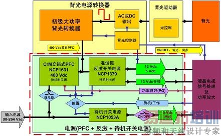 ![]() 图1:液晶电视电源架构多种多样 1) 采用CCFL背光源的32英寸液晶电视电源架构例如,目前市场上销量最大的是32英寸液晶电视。在这类液晶电视中,采用标准24 V逆变器电源的方案在市场上仍占据多数,但新兴的高压液晶电视集成电源(HV-LIPS)的应用也在不断增多,总体上呈现出并存的态势。采用标准24 V逆变器的传统液晶电视在接受110/220 Vac市电输入后,经过整流、PFC及滤波,转换为200/400 Vdc的直流高压。由于传统高压逆变器的输入电压要求是24 Vdc,故PFC的输出电压200/400 Vdc会经过降压转换,产生多路输出电压,其中一路24 Vdc电压提供给高压逆变器,再经过DC-AC转换为超过1,000 V甚至达2,000 V的交流高压,去驱动液晶面板的CCFL阵列。安森美半导体为这类传统液晶电视推出了220 W液晶电视电源GreenPoint®参考设计,其中采用的关键元器件包括NCP1606 CrM PFC控制器、NCP1396谐振半桥控制器及NCP1027待机控制器等。 与这种采用标准24 V逆变器架构的传统电源不同,高压LIPS方案将AC-DC、DC-DC和逆变器结合在同一块电路板上,在获得200/400 Vdc的PFC输出后,会直接将这输出电压作为逆变器的输入,再通过DC-AC转换为驱动CCFL阵列所需的超过1,000 Vac甚至达2,000 Vac的高压,这就消除了24 V转换段,减少大量功率损耗及降低底盘发热量,提升系统总能效,并降低系统成本,还符合"能源之星"等相关能效规范。 针对高压LIPS架构的液晶电视需求,安森美半导体与Microsemi公司合作,推出了用于32英寸液晶电视的比高压LIPS参考设计。这参考设计采用简单直接的CrM PFC段,且无额外待机开关电源,性价比极高。这参考设计采用了安森美半导体的NCP1607 PFC控制器、NCP1351或NCP1219带低待机能耗模式的反激转换控制器,以及Microsemi的LX6503背光控制器等关键IC。这完整液晶电视LIPS电源参考设计功能框图见图2。