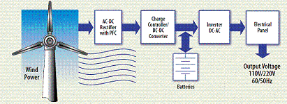 图一中的小型风力发电系统通常包含有风力涡轮机、发电机、交流─直流整流器、充电控制器和可充电电池模块、逆变器、配线以及支持整个系统的塔座,其中充电控制器和电池模块通常是必须的以符合远程离线风能系统的需求。