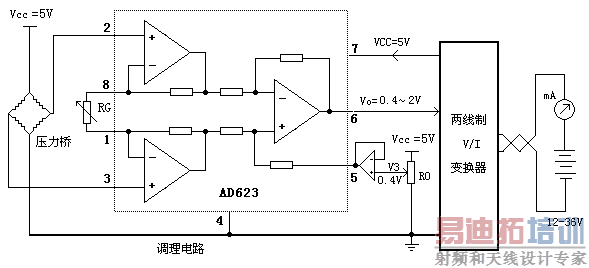 4. 两线制压力变送器设计压力桥、称重传感器输出信号微弱,都属于mV级信号。这一类小信号一般都要求用差动放大器对其进行第一级放大。一般选用低失调、低温飘的差动放大器。另外在两线制应用中,低功耗也是必需的。AD623是常用的低功耗精密差动放大器,常用在差分输出前级的放大。 AD623失调最大200uV,温飘1uV/度,在一般压力变送应用保证了精度足够。 R0将0.4V叠加在AD623的REF脚(5脚)上,在压力=0情况下通过调整R0使输出4mA,再调整RG输出20.00mA,完成校准。电路设计时需注意,压力桥传感器相当于一个千欧级的电阻,耗电一般比较大。适当降低压力桥的激励电压可以减小耗电电流。但是输出幅度也随之下降,需要提高 AD623的增益。图6给出的传感器采用恒压供电,实际应用中大部分半导体压力传感器需要恒流供电才能获得较好的温度特性,可以用一个运放构成恒流源为其提供激励。