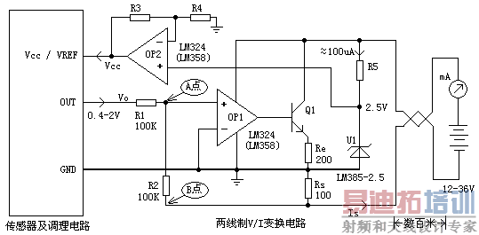 相当于Rs与 R2并联作为电流采样电阻。因此电路总电流: Is=Vo/(Rs//R2) 如果取R2>>Rs,Is=Vo/Rs 因此,图3中取Rs=100欧,当调理电路输出0.4~2V的时候,总耗电电流4~20mA. 若不能满足R2>>Rs也没关系,Rs与 R2并联(Rs//R2)是个固定值,Is与Vo仍然是线性关系,误差比例系数在校准时可以消除。除了电路正确以外,该电路正常工作还需要2个条件:首先要自身耗电尽量小,省下的电流还要供给调理电路以及变送器。其次要求运放能够单电源工作,即在没有负电源情况下,输入端仍能够接受0V输入,并能正常工作。 LM358/324是最常见也是价格最低的单电源运放,耗电400uA/每运放,基本可以接受。