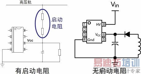 而就待机模式而言,一个重要的损耗来源于启动电路的静态损耗,即启动电阻持续地从大电容消耗电流,造成功率损耗。而降低启动电路损耗的途径有多种,如采用具有极低启动电流的控制器、采用关断时泄漏电流极低的集成启动电流源,以及连接启动电路至半波整流交流输入等。 NCP1237/38/87/88控制器的关键特性 NCP1237、NCP1238、NCP1287和NCP1288是安森美半导体推出的新一代固定频率脉宽调制(PWM)控制器,用于需要高性价比、可靠性、设计灵活性和低待机能耗的应用,如笔记本、LCD显示器、游戏机和打印机的交流-直流(AC-DC)适配器,以及DVD和机顶盒(STB)等消费电子应用。 这系列器件包含一系列关键特性,帮助提升适配器的能效及降低待机能耗。例如,一般控制器需要启动电阻来从整流交流线路电压启动控制器,而在正常工作期间,这启动电阻还持续消耗功率。相比较而言,NCP1237/38/87/88系列控制器内置启动场效应管(FET),这FET用作高压电流源。输入交流电压施加在适配器上时,这个电流源为控制器的VCC电容供电。这种高压启动电路在正常工作条件下关闭(这时由反激辅助绕组提供偏置电压以省电),消耗的功率极低;同时,控制器无需启动电阻(参见图1),帮助降低待机能耗,减少元件数量及节省电路板空间。