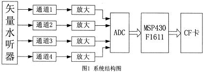 系统对采集的数据只存储而不做信号处理,在处理器的选取上也就不必一味追求高速度,本系统采用TI公司的超低功耗单片机MSP430F1611作为系统的处理器,负责AD的采集,并把采集的数据写入CF卡。这是一款高性价比的单片机,具有以下特点:丰富的片内外设;超低功耗,在电压3.3V主频1MHz时工作电流仅600μA;强大的处理能力,在8MHz晶体驱动下,指令周期为125ns,完全满足系统的处理需求。系统总的结构图如图1所示。