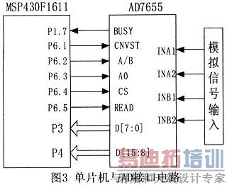 为了降低系统功耗,在我们系统指标要求的前提下,ADC器件的选取尽量选用低功耗ADC器件。设计中我们采用了美国ADI公司的AD7655,这款ADC采样率在10kSPS时功耗仅2.6mW,有四个模拟输入通道,精度为16bit,最高采样率高达1MSPS。数据输出接口支持串行和并行两种方式,可以方便地与单片机、DSP等处理器实现无缝连接。具体的AD与单片机的硬件接口图如图3所示。