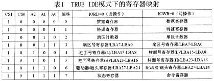 CF卡的读写是以扇区(sector)为单位的,每次读写一个或连续的多个扇区,每个扇区大小为512字节。对CF卡的读写访问操作都是通过访问其内部寄存器来实现的,对不同的寄存器进行访问是靠上节所提到的A0~A2、CSO、CSl这五根数据线来译码的,在本文的设计中,CF卡配置成TRUE IDE工作模式,具体的寄存器映射如表1所示。