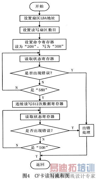 读写扇区时,首先需要设置起始扇区的LBA地址和扇区数目,并设置命令寄存器,读取数据设置命令"20H",写入数据设置命令"30H"。然后读取状态寄存器,判断状态寄存器是否为"58H"。若为是,则开始读写操作;若为否则继续读取状态寄存器。接下来读状态寄存器是否为"50H",判断CF卡操作是否完成。若为否,则继续读取判断;若为是,则结束读写过程。如果在判断状态寄存器中发生了超时或出现错误,则设置超时或错误标志,并跳出读写过程。图4为CF卡读写一个扇区的流程图。