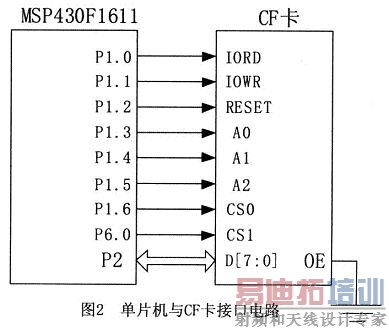 MSP430F1611拥有六个可独立配置的双向8位I/O端口(P1~P6)。本文的设计中将P1端口的P1.0、P1.1引脚分别与CF卡的读写信号线IORD、IOWR相连;复位信号RESET由P1.2给出;A0~A2为数据、命令或状态寄存器地址线,由单片机P1.3~P1.5管脚控制。CF卡总共有16根数据线D[15:0],但可以通过软件设定其工作在16 bit模式还是8 bit模式,由于MSP430F161l单片机数据线宽为8位,硬件中设计其工作在8 bit模式,使用D0~D7为数据线,与单片机的P2端口相连,D8~D15悬空。