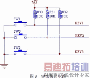 键盘接口电路如图3 所示。键盘设计由三个按键控制即:"开关"键、"+"键、"-"键, 并外接三个上拉电阻控制键盘去抖。此三键分别连接到单片机的P1.0、P1.1、P1.2 接口进行控制。