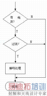 ![]() 图6 主程序流程图 3.2 过流保护程序从数模转换电路转换出的信号,一路经过流检测电路,把检测到的信号,送入单片机最 小系统进行处理,若过流,则蜂鸣器鸣叫。过流保护程序流程图如图7 所示。