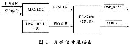 如图4所示,复位的输入包括两个部分:MAX1232输出的RESETA和电源芯片TPS73HD318输出的RESETB。MAX1232的输入为手动复位信号输入和看门狗喂狗信号输入。手动复位信号来自复位按钮,喂狗信号来自CPLD。复位输出2个信号分别给DSP,D/A使用。