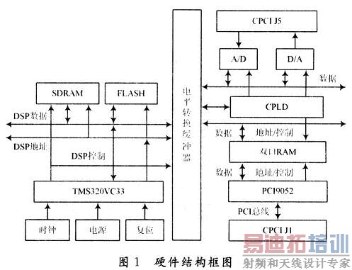 如图1硬件结构框图所示,该模块采用TI公司高性能CPU器件TMS320VC33为核心。模块通过PCI9052芯片与CPCI总线连接,PCI9052的本地总线的信号连接到双口RAM的一端。双口RAM的另一端通过电平缓冲器连接DSP。