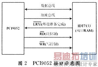如图2所示PCI9052与双口RAM连接的本地总线信号包括地址、数据、控制信号3个部分。地址总线宽度为12位,数据总线宽度为16位,因此寻址空间为2 KB的16 b地址空间。控制信号包括读写控制信号和外设准备完成信号,当双口RAM将外设准备完成信号拉低后,主机就可以通过输出读写控制信号对双口RAM进行读写的操作。