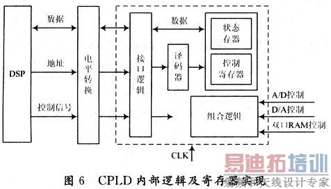 CPLD片内逻辑实现描述框图见图6。在CPLD内部主要实现了三个的功能,与DSP总线的逻辑接口、内部的寄存器、控制逻辑。