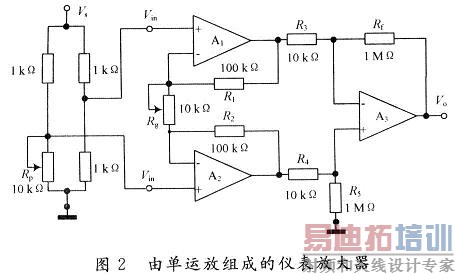 (1)注意关键元器件的选取,比如对图2所示电路,要注意使运放A1,A2的特性尽可能一致;选用电阻时,应该使用低温度系数的电阻,以获得尽可能低的漂移;对R3,R4,R5和R6的选择应尽可能匹配。
