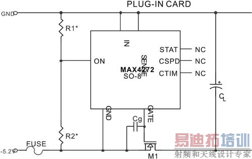 ![]() 图1 2芯片方案,在两个电源通道均提供过载故障检测 每个通道均提供过载(电流大约为1A)故障关断,发生故障时可以自动重新开启。MAX5900利用M2 MOSFET的RDS(ON)作为检流电阻,VSENSE的触发门限为200mV。选择RDS(ON) = 0.2 的MOSFET作为M2,可以获得大约1A的过载门限。有关延时和定时信息,请参考器件的数据手册。 单芯片方案 图2电路在正、负电源同时提供限流、热插拔启动控制功能,但仅为+5V电源提供断路器功能。以下介绍的单芯片方案利用MAX5904同时支持+5V和-5.2V的热插拔,MAX5904设计用于控制两路正电源的带电插拔,按照如下电路设计,可以用其控制一路正电源和一路负电源。选择MAX5904的优势是能够控制两路电源,并且只需要很少的外部元件。