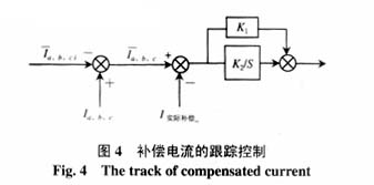 图4所示为电流跟踪控制框图。本系统的电流跟踪控制采用PI控制,输出控制量通过双口RAM送至脉冲发生器,脉冲发生器根据得到的波形信息产生触发脉冲,脉冲经隔离、整形后驱动主电路的IGBT使逆变器输出相应电压。补偿电流是由逆变器的输出电压与交流侧电源电压的差值作用于电感而产生的。