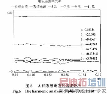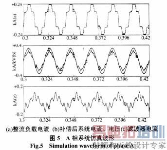 图5是用该有源滤波器对三相6脉冲整流负载产生的谐波进行补偿的A相数字仿真结果图,仿真软件采用PSCAD。由图可知补偿后的系统电流与系统电压同相位,电流波形得到大大改善,但比较负荷电流和系统电流可知,在负荷电流变化较快瞬间(对应于整流桥的换相)补偿效果差一些,这是因为要补偿快速变化的电流要求APF产生很高的谐波电压,这一方面要求有源滤波器有很快的响应速度,另一方面要求直流侧产生高压,这在实际装置中是较难实现的,因此在负载电流变化非常快时,APF的补偿能力较差。有关系统不对称对APF的影响及其对零序电流的补偿等问题仍在进一步的研究中。图6为A相系统电流的谐波分析,负载电流的谐波总畸变率THD为20.1%,补偿后的系统电流总畸变率为9.4%,5、7、9、11次谐波电流的含有率均小于5%。