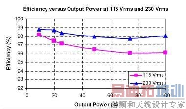 例如,在提升PFC能效方面,除了交错式PFC等新颖技术,安森美半导体还对无桥PFC方案进行了研究。这种PFC架构旨在去掉二极管整流桥,减少整流过程中的功率损耗,大幅提升PFC能效。安森美半导体基于这种架构开发了800 W PFC 段的原型。这原型采用NCP1653 PFC 控制器及MC33152 MOSFET 驱动器。经测试,这原型在90 Vrms、满载、无风扇(机箱打开,室温)条件下的能效达94%,而在100 Vrms 时达95%。在20%负载时能效更接近或超过96%。这种无桥PFC 架构将是适合大功率应用的一种极高能效的解决方案。