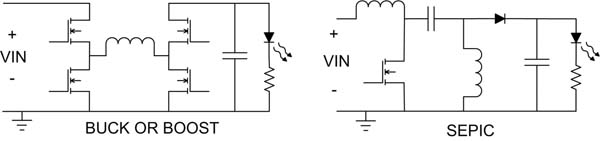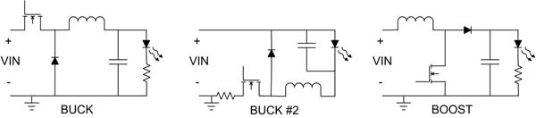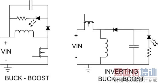 表1备选的LED电源拓扑 图1显示了三种基本的电源拓扑示例。第一个示意图所显示的降压稳压器适用于输出电压总小于输入电压的情形。在图1中,降压稳压器会通过改变MOSFET的开启时间来控制电流进入LED。电流感应可通过测量电阻器两端的电压获得,其中该电阻器应与LED串联。对该方法来说,重要的设计难题是如何驱动MOSFET。从性价比的角度来说,推荐使用需要浮动栅极驱动的N通道场效应晶体管(FET)。这需要一个驱动变压器或浮动驱动电路(其可用于维持内部电压高于输入电压)。 图1还显示了备选的降压稳压器(buck#2)。在此电路中,MOSFET对接地进行驱动,从而大大降低了驱动电路要求。该电路可选择通过监测FET电流或与LED串联的电流感应电阻来感应LED电流。后者需要一个电平移位电路来获得电源接地的信息,但这会使简单的设计复杂化。另外,图1中还显示了一个升压转换器,该转换器可在输出电压总是大于输入电压时使用。由于MOSFET对接地进行驱动并且电流感应电阻也采用接地参考,因此此类拓扑设计起来就很容易。该电路的一个不足之处是在短路期间,通过电感器的电流会毫无限制。您可以通过保险丝或电子断路器的形式来增加故障保护。此外,某些更为复杂的拓扑也可提供此类保护。