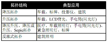 表1中所显示的信息有助于为LED驱动器选择最佳的开关拓扑。除这些拓扑之外,您还可使用简易的限流电阻器或线性稳压器来驱动LED,但是此类方法通常会浪费过多功率。所有相关的设计参数包括输入电压范围、驱动的LED数量、LED电流、隔离、EMI抑制以及效率。大多数的LED驱动电路都属于下列拓扑类型:降压型、升压型、降压-升压型、SEPIC和反激式拓扑。