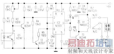附图是检测器电路。 H21Al(IC1) 是红外线光开关,它实际上是一只光断续器。 R1 限制 IC1 中 LED 的电流。 IC1 中晶体管部分在正常情况下处于导通状态,因此 T1 基极为低电位。