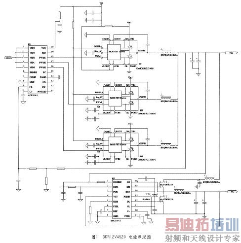 电源DDR12V4520的主电源输出电压为1.5V~2.8V,额定输出电流45A。匹配电源跟踪l/2主电源电压,可以输出或吸入电流,额定容量20A。图l是该电源的原理图。图2给出了完成贴装焊接的电源DDRl2V4520的实物照片。主电源控制器为ADP3163(Analog Devices),匹配电源控制器为MAXl917(Maxim)。主电源的功率器件采用三合一DrMOSR2J20601(Renesas),匹配电源的功率器件是FDD6035AL和FDD8870(Fairchild)。输出采用低串联阻抗固体有机膜电容器滤波,实用效果十分理想。主电源的输出电压通过5位VID码设定(ADP3163),使用十分方便,电压精度可达0.025V。
