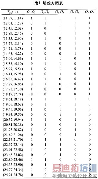 表1所示是某电路的熔丝调节方案。其中Tosc表示所测振荡方波周期。"0"表示Oa-Ob间的熔丝不熔断,"1"表示Oa-Ob间的熔丝熔断。Tosc超出表1第一列所示范围则判为无效。调节精度为0.44μs/(一个最小调节单位)。