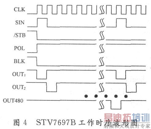 图4是芯片的工作时序波形图,工作时SIN脚接收从控制板发出的扫描信号,极性传输方向选择控制端F/R选择传输方向,信号在行同步时钟CLK的上升沿变化瞬间在移位寄存器中移位前进,在STB控制下移位寄存器的数据就放到锁存器中,当BLK允许输出时,信号经过内部功率放大器增益输出相应的高压信号。