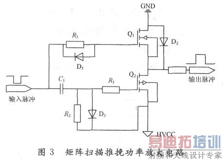 如图3所示,采用的是由功率型MOS管组成的推挽电路,低压扫描脉冲进入到高压驱动单元进行放大。电路工作时,两只对称的功率开关管每次只有一个导通,所以导通损耗小,效率高。图3中MOS管Q1,Q2的参数相同,以推挽方式存在于电路中。当脉冲为高电平时,Q1管导通,Q2管截止,电路输出低电平;当脉冲为低电平时,Q1管截止,Q2管导通,电路输出高电平。通过两只MOS管的交互导通,从而减低了功耗,提高了每个管的承受能力,适合于FED驱动大电流的要求。由电阻R2和二极管D3组成的并联钳位电路,目的是使MOS的导通速度加快。