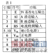 DJOD - S 是双通道直流电机控制驱动模块,工作电压有 6V 、 12V 、 24V 供选择,输出电流范围为 0 . 5 - 2 . 5A ( 用户无法更改 ) 。该模块有 10 个引脚。各脚功能如表 1 ,其中②、③脚为 5VTTL / CMOS 兼容电平输入端;⑦、⑧脚为输出端,输入和输出的对应关系如表 2 。 R1 、 R2 为限流取样电阻,取值范围 0 . 2-1 . 2 Ω,可以根据所要求的最大停机电流 I 进行计算,公式为 R=0 . 6/I 。如需限制模块最大输出电流为 1 . 5A ,则 R=0 . 6 / 1 . 5=0 . 4 。模块电流检测电路可保证负载过流时自动关断电源。另外,⑨脚加 1v 以上脉冲也可关断模块电源。