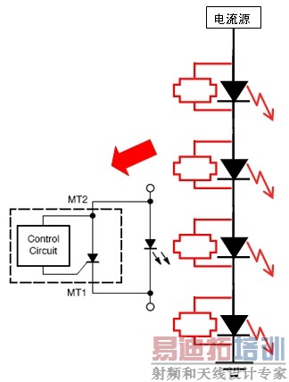 值得一提的是,在照明应用中,如果输出功率要求高于25 W,LED驱动器则面临着功率因数校正(PFC)的问题。在这类可能需要采用PFC控制器的应用中,传统的解决方案是PFC控制器+PWM控制器的两段式方案。这种方案支持模块化,且认证简单,但在总体能效方面会有折衷,如假设交流-直流(AC-DC)段的能效为87%至90%,直流-直流(DC-DC)段能效为85%至90%,则总能效仅为74%至81%。随着LED技术的持续改进,这种架构预计将转化为更加优化、更高能效的方案。根据要求的不同,有多种可供选择的方案,如:PFC+非隔离降压、PFC+非隔离反激或半桥LLC、NCP1651/NCP1652单段式PFC方案。 保护通用照明应用中的LED 如前所述,LED是一种使用寿命极长的光源(可长达5万小时)。除了需要针对具体的LED应用选择适合的LED驱动解决方案,还需要为LED提供适当的保护,因为偶尔LED也会失效。其原因多种多样,可能是因为LED早期失效,也可能是因为局部的组装缺陷或是因瞬态现象导致失效。必须对这些可能的失效提供预防措施,特别是因为某些应用属于关键应用(故障停机成本高),或是安全攸关的应用(如头灯、灯塔、桥梁、飞行器、飞机跑道等),或是在地理上难于接近的应用(维护困难)等。在这方面,可以采用安森美半导体的NUD4700 LED分流保护解决方案。图5是这种分流保护解决方案的应用及原理示意图。 在LED正常工作时,泄漏电流仅为近100 μA;而在遭遇瞬态或浪涌条件时,LED就会开路,这时NUD4700分流保护器所在的分流通道激活,所带来的压降仅为1.0 V,将带给电路的影响尽可能地减小。这器件采用节省空间的小型封装,设计用于1 W LED(额定电流为350 mA@ 3 V),如果散热处理恰当,也支持大于1 A电流的操作。