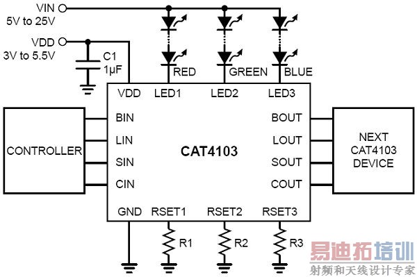 CAT4103支持每通道达175 mA的宽广范围LED恒流驱动,电流为60 mA时压降电平至0.3 V ,确保在驱动长串LED时提供最高性能。这种驱动器每通道支持25 V的电压电平,能够以超过10瓦(W)的高亮度功率电平支持RGB像素。