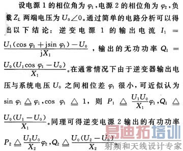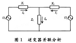 多台逆变器并联运行时应满足下列条件:各逆变器的交流输出电压要保证同频、同相、同幅,否则就会在各逆变器之间引起环流,影响系统的稳定运行,甚至造成严重的事故。下面以2台逆变电源对同一负载供电为例进行分析,等效电路图如图1所示。