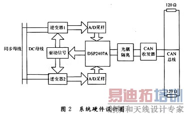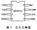 CAN总线收发器选用Microchip公司的MCP2551,MCP2551是一个可容错的高速CAN器件,可作为CAN协议控制器和物理总线接口。MCP2551可为CAN协议控制器提供差分收发能力,它完全符合ISO-11898标准,包括能满足24 V电压要求。它的工作速率高达1 Mb/s。RS引脚可选择3种操作模式:高速、斜率控制、待机。在本系统中为了通过限制CANH和CANL的上升下降时间来进一步减少EMI,选用斜率控制模式。系统硬件设计图如图2所示。